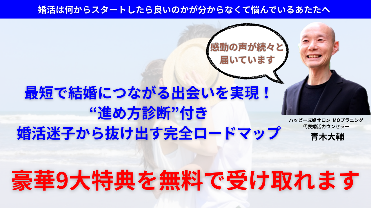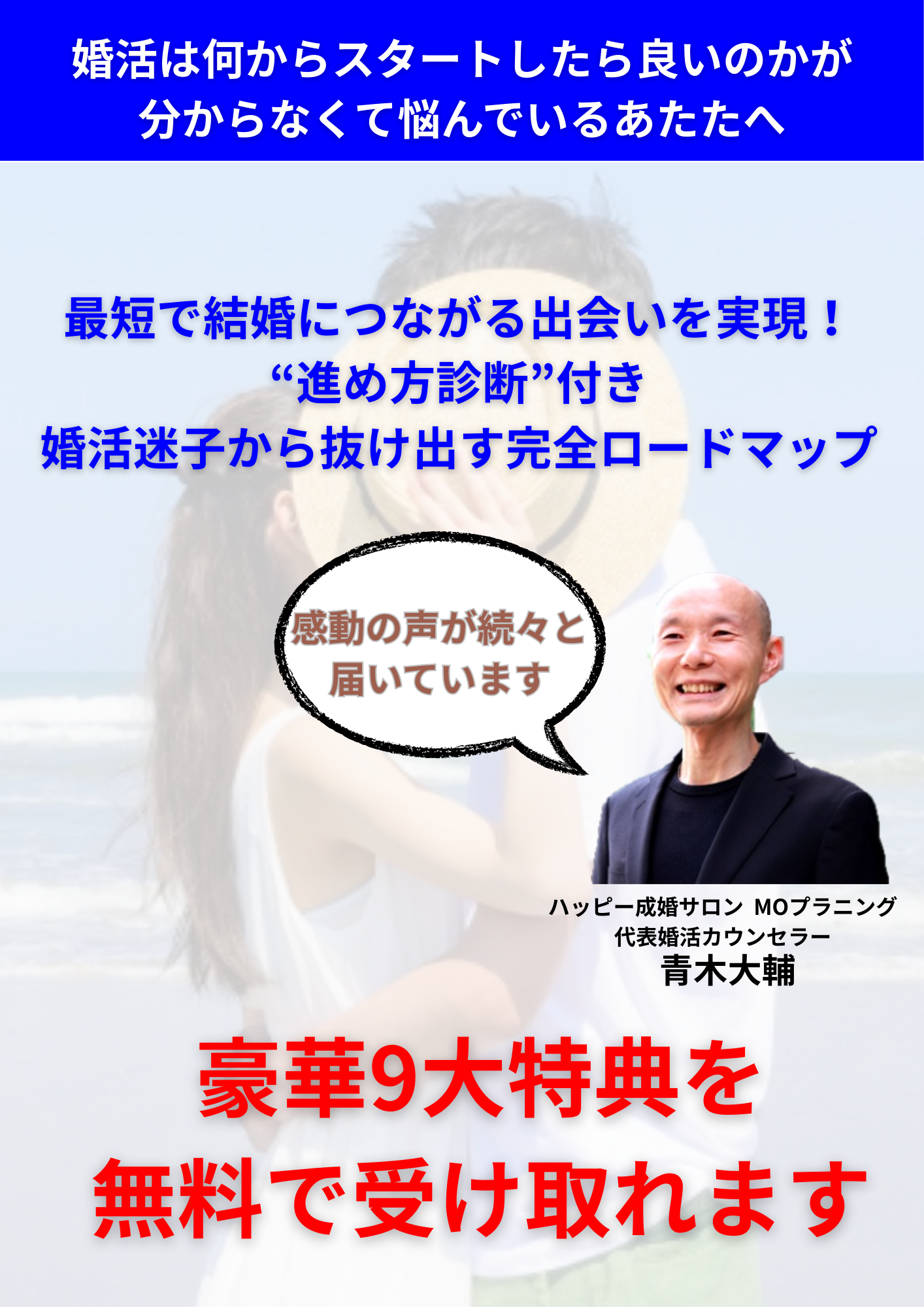 「どう動けばいいのか分からない…」そんな婚活迷子を救うために、今すぐ役立つ9大特典をご用意しました。